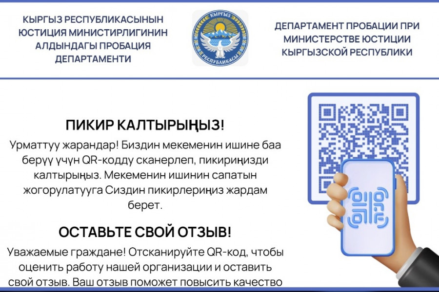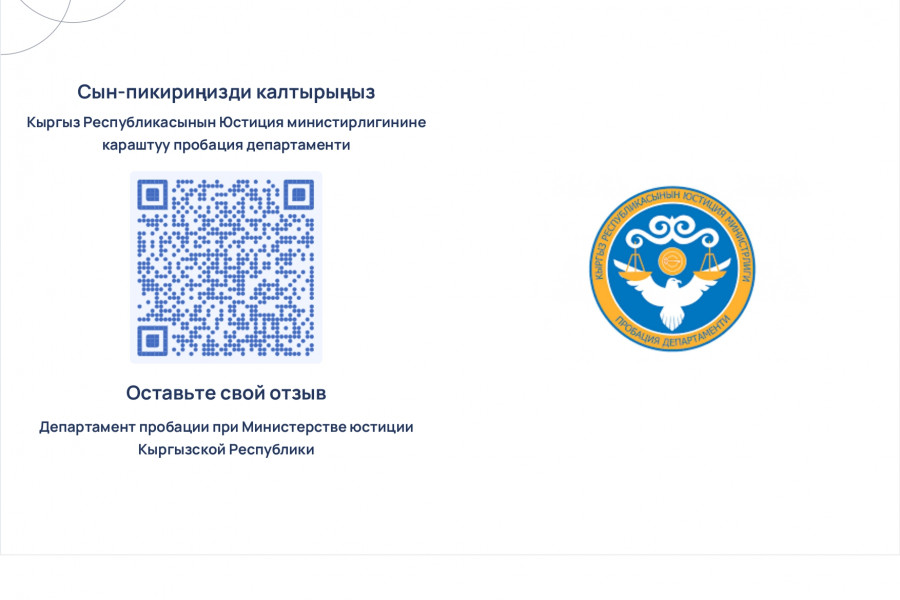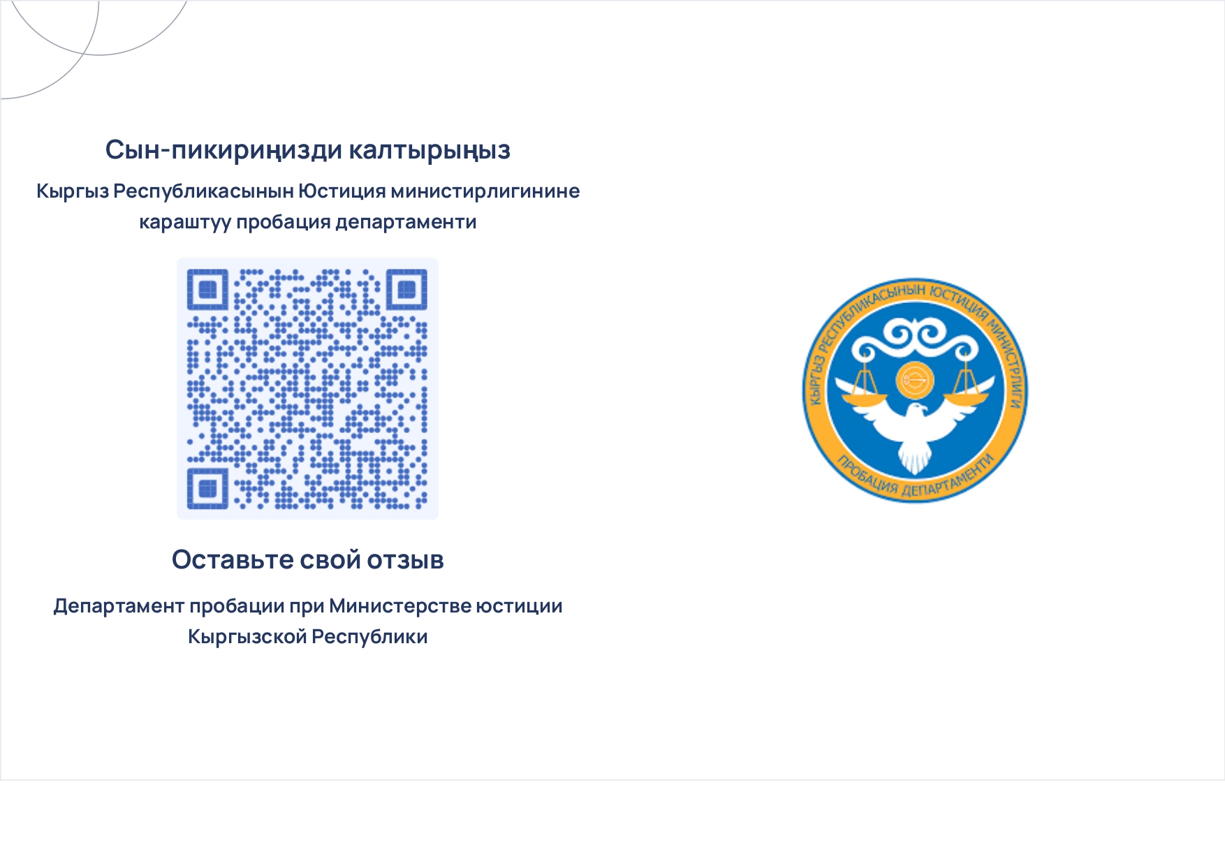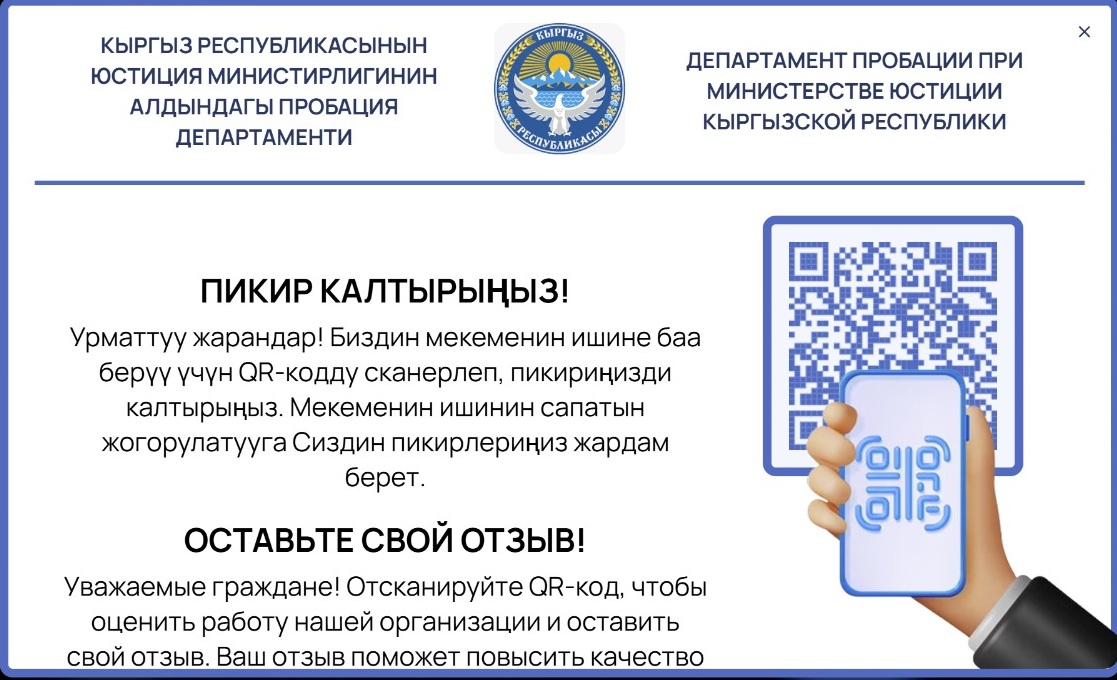 Башкы / Окуялар / Жаңылыктар / Пробация департаментинин ишмердүүлүгү жөнүндө QR код аркылуу кантип пикир калтырса болот?